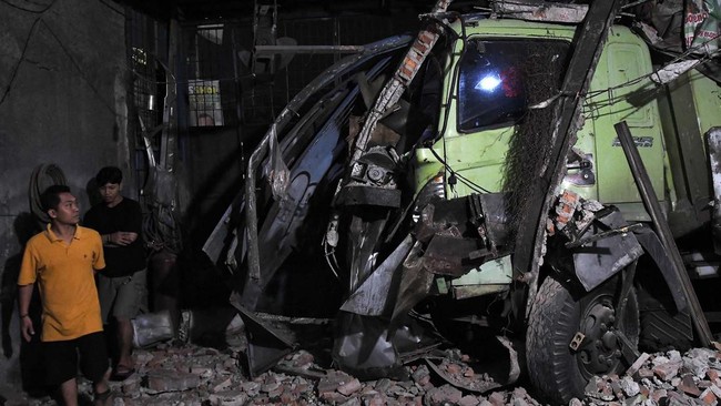 Bekasi - Dua truk kontainer mengalami kecelakaan di Jalan Sultan Agung, Bekasi, Kamis (27/8) dini hari. Kecelakaan itu mengakibatkan pagar bengkel las rusak.