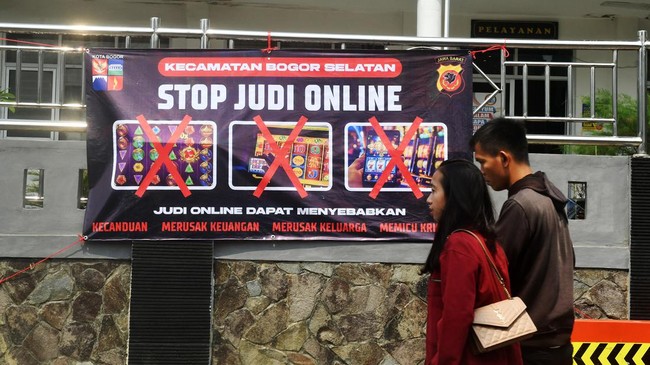 Bogor - Spanduk sosialisasi larangan judi online bertebaran di wilayah Kecamatan Bogor Selatan. Salah satu spanduk mejeng di pagar Kantor Kecamatan Bogor Selatan.