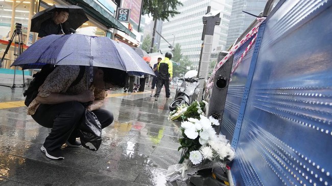Seorang pria meletakkan bunga di lokasi kecelakaan maut mobil dekat Balai Kota Seoul, Korea Selatan, Selasa (2/7/2024). Setidaknya sembilan orang tewas dan empat lainnya terluka ketika sebuah mobil menabrak pejalan kaki di dekat balai kota Seoul Senin (1/7/2024) malam waktu setempat.