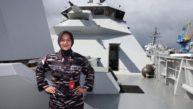 Pelaut angkatan laut Indonesia Bella Lovita berdiri di atas KRI Raden Eddy Martadinata selama latihan militer Lingkar Pasifik (Rimpac) di Pangkalan Gabungan Pearl Harbor-Hickam, Hawaii, AS 3 Juli 2024. Latihan itu melibatkan 40 kapal perang permukaan, tiga kapal selam, pasukan Marinir dari 14 negara, 150 pesawat, dan total 25.000 lebih prajurit dari angkatan laut berbagai negara.