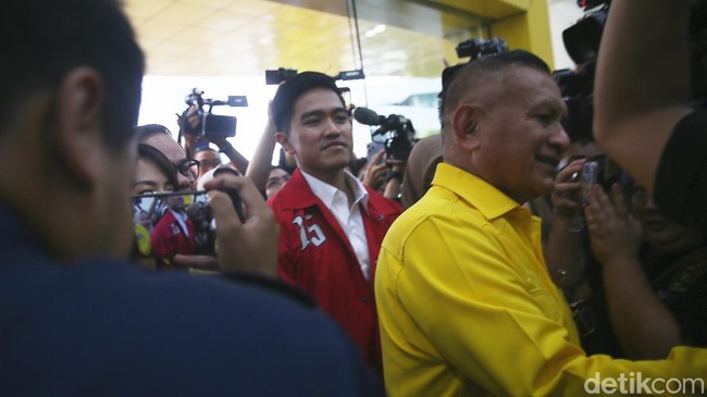 Jakarta - Ketua Umum PSI Kaesang Pangarep menyambangi DPP Partai Golkar, Palmerah, Jakarta Barat. Pengurus PSI kompak menggunakan rompi merah bertuliskan 'Circle K'.