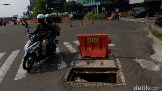 Tangerang Selatan - Terdapat lubang akibat tidak adanya lubang gorong-gorong di Pondok Cabe, Tangerang Selatan (Tangsel). Lubang di jalan ditutup oleh barrier.