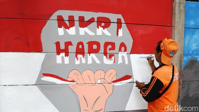 Jakarta - PPSU turut menyemarakkan HUT ke-79 RI dengan membuat mural di kawasan Guntur, Jakarta Selatan, Selasa (23/7/2024). Mural itu bertema kemerdekaan.