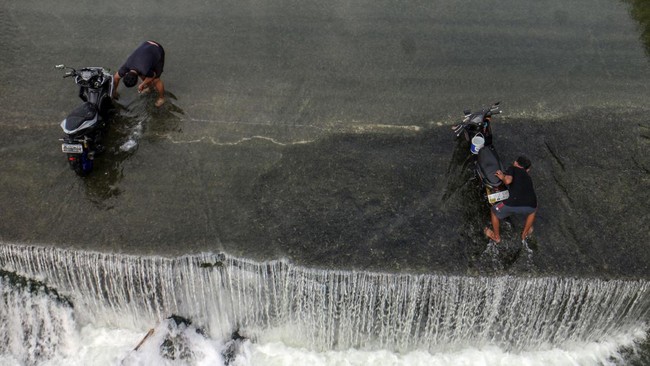 Bogor - Warga bantaran Sungai Cileungsi memanfaatkan air sungai untuk mandi hingga cuci motor. Hal itu dilakukan di tengah musim kemarau.