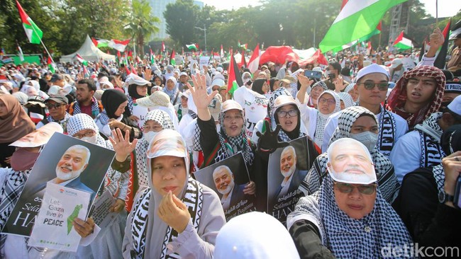 Jakarta - Aliansi Rakyat Indonesia Bela Palestina serta Komite Solidaritas Palestina dan Yaman (KOSPY) gelar aksi solidaritas di Kedubes AS, Sabtu (3/8). Ni foto-fotonya.