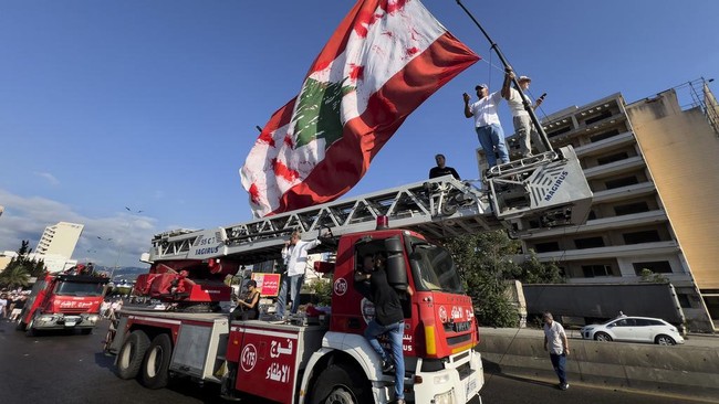 Keluarga korban tewas dalam ledakan mematikan di pelabuhan Beirut tahun 2020, mengibarkan bendera Lebanon berukuran besar saat mereka berdiri di tangga mobil pemadam kebakaran di Beirut, Lebanon, Minggu (4/8/2024).