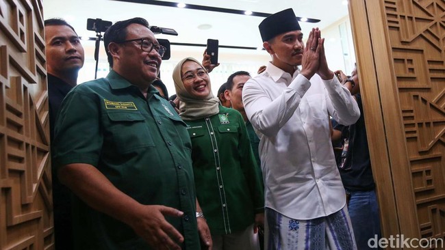 Jakarta - Ketum PSI, Kaesang Pangarep, menyambangi DPP PKB untuk bertemu Ketum PKB Muhaimin Iskandar atau Cak Imin. Kaesang datang dengan mengenakan sarung dan peci.