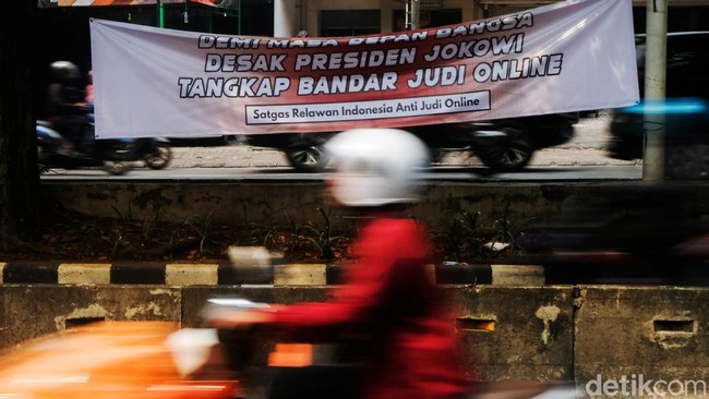 Jakarta - Spanduk desakan kepada Presiden Jokowi menangkap bandar judi online (judol) terpasang di Jalan Sultan Iskandar Muda, Jakarta, Rabu (7/8/2024). Ini spanduknya.