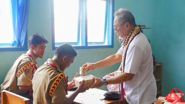 Lampung - Menteri Perdagangan Zulkifli Hasan melakukan uji coba makan bergizi gratis di SMA 1 Sidomulyo, Lampung, Jumat (9/8/2024). Begini potretnya.