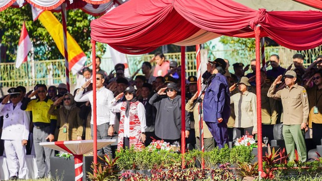 NTB - Menteri Lingkungan Hidup dan Kehutanan Siti Nurbaya memimpin upacara HUT ke-79 RI di Taman Nasional Gunung Rinjani, NTB, Sabtu (17/8/2024). Begini potretnya.
