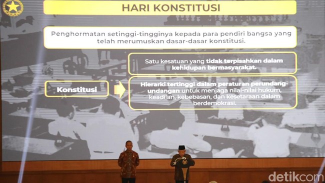Jakarta - Peringatan Hari Konstitusi digelar di Komplek Parlemen. Peringatan ini dihadiri Ketua MPR Bambang Soesatyo dan Wakil Presiden KH Ma'ruf Amin.