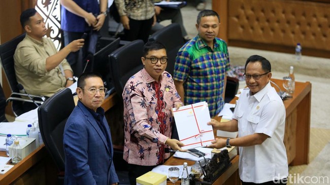 Menteri Dalam Negeri Tito Karnavian menyerahkan pandangan pemerintah terhadap revisi UU Pilkada kepada Wakil Ketua Baleg DPR RI yang bertindak sebagai pimpinan rapat, Achmad Baidowi di Komplek Parlemen, Senayan, Jakarta, Rabu (21/8/2024).