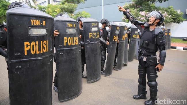 Jakarta - Kepolisian mengerahkan 2.013 personel gabungan untuk mengamankan aksi di depan Gedung DPR/MPR RI. Kendaraan lapis baja dan watercannon juga disiagakan.