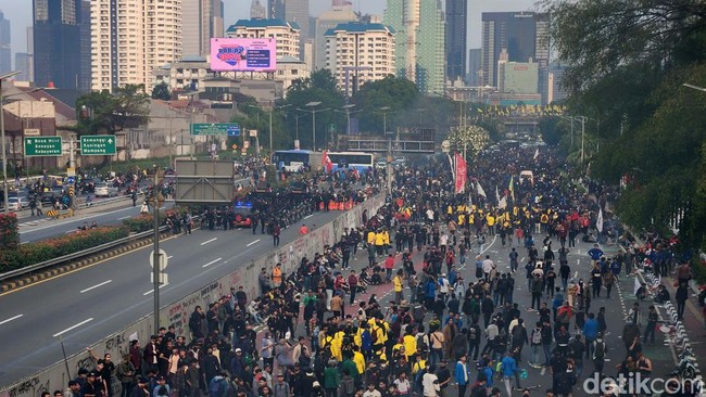 Jakarta - Massa yang menggelar demo di depan gedung DPR, Jalan Gatot Subroto, Jakarta Pusat, menerobos jalan Tol Dalam Kota. Arus lalu lintas di dalam tol pun terhenti.