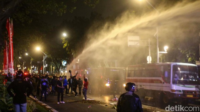 Jakarta - Massa aksi mulai dipukul mundur polisi dari depan gedung DPR hingga jalan Gerbang Pemuda. Polisi menembakkan gas air mata dan water cannon.