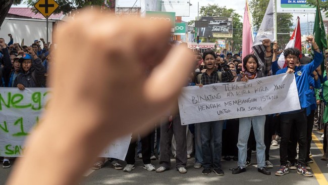 Sejumlah mahasiswa mengepalkan tangan dan meneriakkan yel-yel saat berunjuk rasa di depan kantor DPRD Sulawesi Tengah di Palu, Sulawesi Tengah, Jumat (23/8/2024).