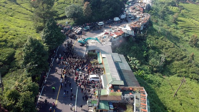 Kabupaten Bogor - Pembongkaran lapak Pedagang Kaki Lima (PKL) tahap dua dilakukan di kawasan wisata Puncak, Cisarua, Kabupaten Bogor, Jawa Barat. Begini potretnya dari udara.