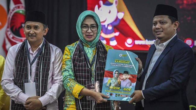 Banten - Airin Rachmi Diany-Ade Sumardi resmi mendaftarkan diri sebagai cagub dan cawagub Banten. Penyerahan dokumen persyaratan dilakukan di aula utama KPU Banten.