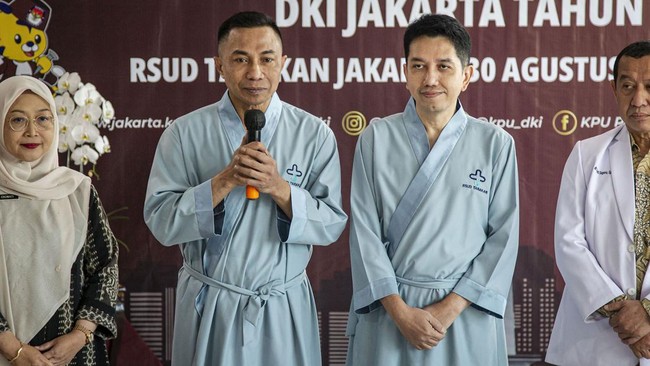 Jakarta - Cagub dan Cawagub DKI Jakarta Dharma Pongrekun dan Kun Wardana menjalani tes kesehatan hari ini. Dharma-Kun tes kesehatan di RSUD Tarakan, Jakarta.