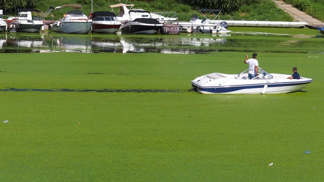 Serbia - Sungai Sava di Belgrade menghijau ditutupi lapisan tebal ganggang hijau akibat panas. Pakar menghubungkan mekarnya ganggang dengan perubahan iklim.