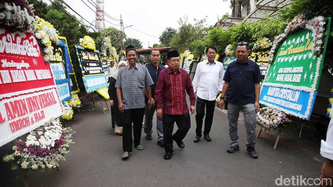 Wakil Presiden RI ke-10 dan ke-12 Jusuf Kalla tiba di rumah duka Kompleks Gudang Peluru, Jakarta Selatan.