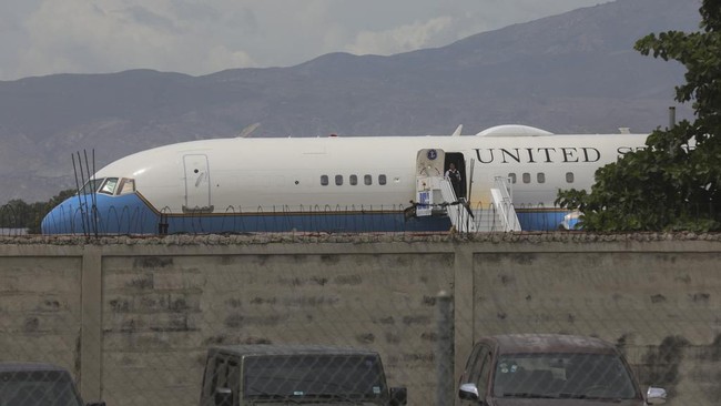 Pesawat yang membawa Menteri Luar Negeri AS Antony Blinken tiba di Bandara Internasional Toussaint Louverture di Port-au-Prince, Haiti, Kamis (5/9/2024). (AP Photo/Odelyn Joseph)
