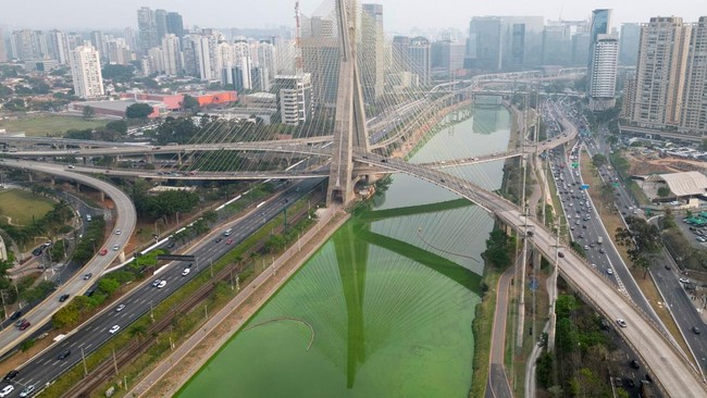Pemandangan dari drone menunjukkan Sungai Pinheiros berubah menjadi hijau di Sao Paulo, Brasil, Selasa (10/9/2024).