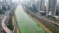Pemandangan dari drone menunjukkan Sungai Pinheiros berubah menjadi hijau di Sao Paulo, Brasil, Selasa (10/9/2024).