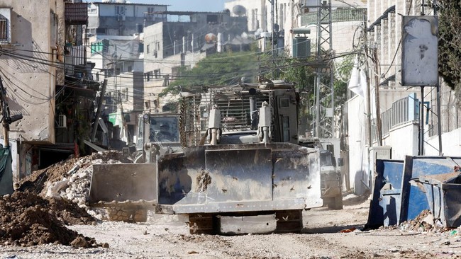 Tepi Barat - Serangan militer Israel berlanjut di Tulkarm. Buldoser Israel terlihat di kota itu menghancurkan jalan-jalan kota.