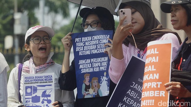 Jakarta - Para aktivis menggelar aksi unjuk rasa di depan Gedung DPR RI. Mereka mendesak DPR untuk mengesahkan RUU Perlindungan Pekerja Rumah Tangga (PPRT) menjadi UU.