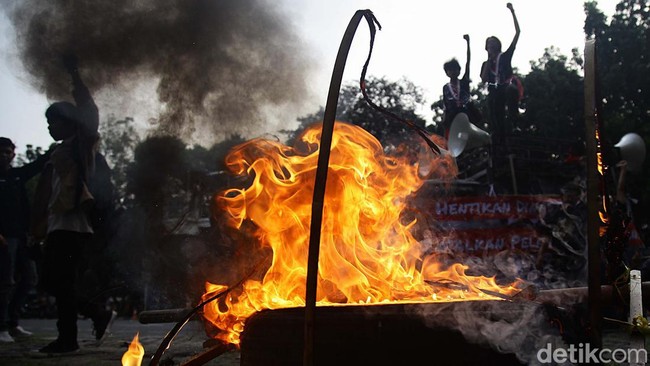 Jakarta - Massa dari Gerakan Mahasiswa Nasional Indonesia (GMNI) gelar aksi di deapn gedung KPK. Mereka membakar ban sebagai bentuk protes praktik KKN.