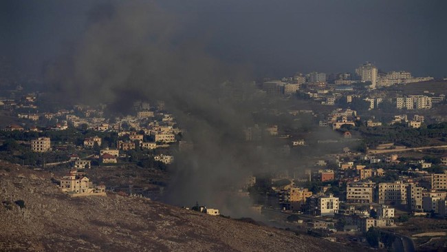 Asap mengepul saat serangan udara menggempur desa Kfar Rouman yang terlihat dari kota Marjayoun, Lebanon selatan, Senin (23/9/2024). AP Photo/Hussein Malla