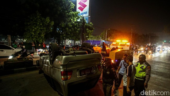 Bekasi - Sebuah mobil dinas plat merah terguling di Tambun, Bekasi. Warga setempat membantu proses evakuasi mobil tersebut.