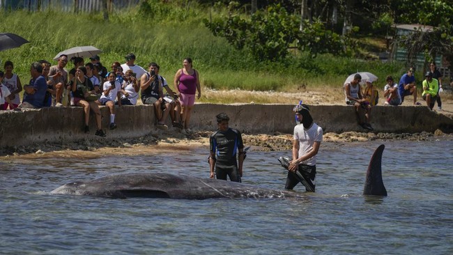 Kuba - Seekor paus ditemukan mati terdampar laut baracoa, provinsi Artemisa, Kuba, Kamis (3/10/2024). Belum diketahui penyebab kematian paus tersebut.