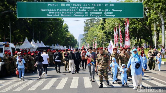 Jakarta - Sejumlah warga memadati kawasan depan Istana Merdeka, Jakarta. Warga yang hadir ingin menyaksikan langsung acara pisah sambut presiden dan pesta rakyat.