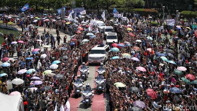 Jakarta - Presiden Prabowo Subianto disambut lautan manusia yang menunggunya melintas di Bundaran HI, Jakarta Pusat. Prabowo pun menyapa serta menyalami warga.