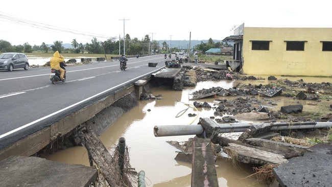 Puing-puing dari jalan dan tiang listrik yang rusak akibat Badai Tropical Trami, yang secara lokal disebut Kristine, di Polangui, provinsi Albay, Filipina, Rabu (23/10/2024). (AP Photo/John Michael Magdasoc)