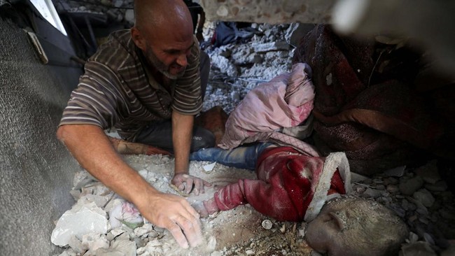 Seorang pria berusaha mengeluarkan jenazah seorang anak Palestina yang terjebak di reruntuhan bangunan sekolah yang hancur dibom Israel, Senin (28/10) waktu setempat.