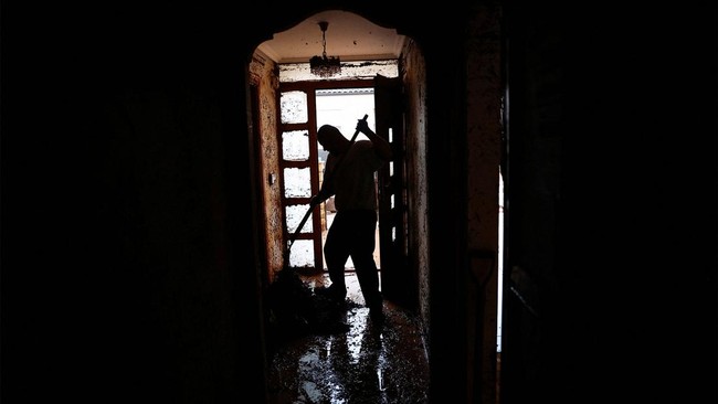 Spanyol - Banjir yang menerjang Utiel dan Valencia, Spanyol, sudah surut. Warga pun mulai membersihkan lumpur sisa banjir.