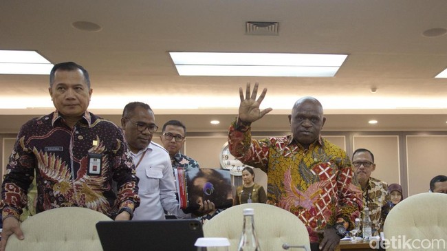 Jakarta - Menteri HAM Natalius Pigai rapat kerja dengan Komisi XIII DPR RI. Raker tersebut turut membahas usulan Pigai terkait anggaran Rp20 triliun untuk Kementerian HAM
