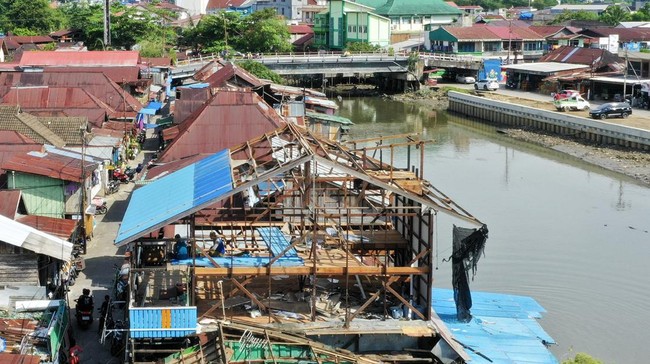 Samarinda - Warga membongkar sendiri rumahnya di bantaran Sungai Karang Mumus, Samarinda. Pembongkaran dilakukan karena kawasan itu akan ditata oleh Pemkot Samarinda.