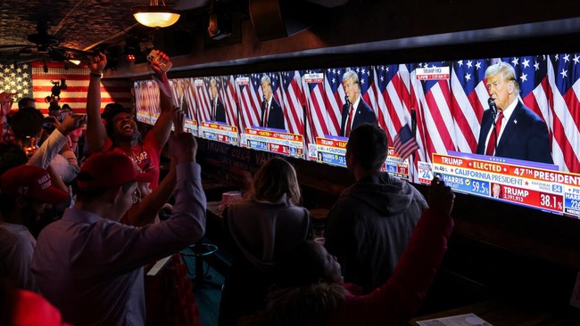 Amerika Serikat - Pendukung Trump bersorak dalam perayaan setelah Fox News mengumumkan Pemilihan Presiden AS 2024. Begini potretnya.