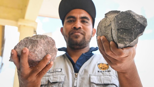 Petugas Pusat Vulkanologi & Mitigasi Bencana Geologi (PVMBG) Badan Geologi Kementerian ESDM menunjukkan batu dari erupsi Gunung Lewotobi Laki-laki yang terlontar hingga tujuh kilometer di Desa Pululera, Kabupaten Flores Timur, Nusa Tenggara Timur, Kamis (7/11/2024).