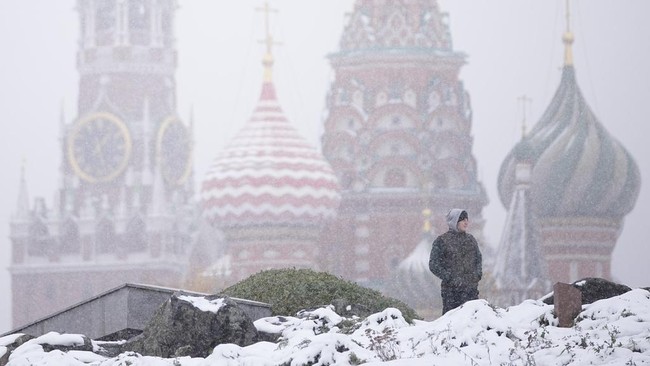 Seorang pria berjalan di taman Zaryadye dengan menara Spasskaya Kremlin dan Katedral St. Basil di latar belakang saat hujan salju di Moskow, Rusia, Rabu (6/11/2024).
