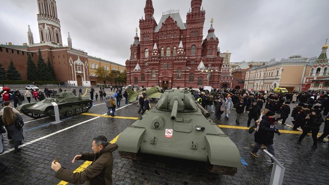 Seorang pria berswafoto di depan tank legendaris era Soviet T-34 di Lapangan Merah, di Moskow, Rusia, Kamis (7/11/2024).
