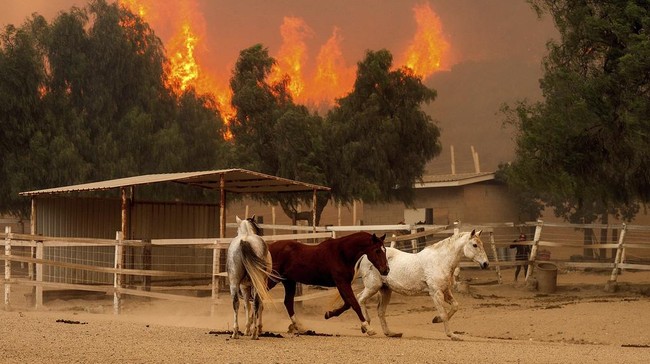 California - Kebakaran hutan di California menyebar dengan cepat oleh angin kencang. Kuda-kuda pun berlarian dari kandang saat api mulai menyebar.