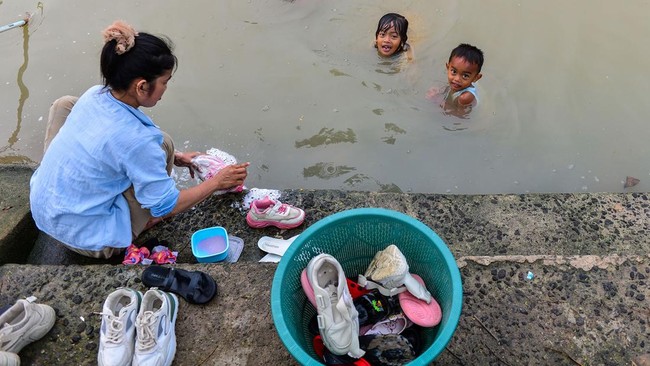 Banten - Warga menjadikan kali Anyar di Serang, Banten, sebagai tempat mencuci dan mandi. Mereka melakukan itu karena tidak memiliki akses air bersih dan layak konsumsi.