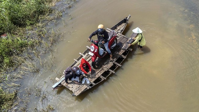 Jambi - Banjir merendam Jalan Lintas Jambi-Berbak, Jambi. Banjir yang terjadi sejak seminggu terakhir itu dimanfaatkan warga untuk membuka jasa penyeberangan motor.