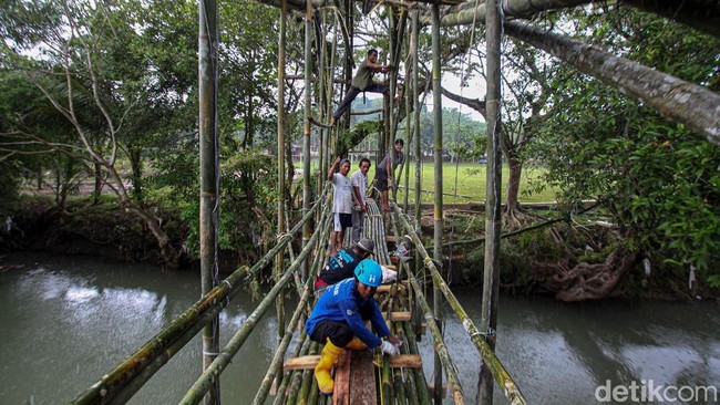 Sukabumi - Warga bergotong-royong membangun jembatan darurat yang menghubungkan Desa Cariu dengan Desa Bobojong, Cidolog, Sukabumi. Jembatan itu terbuat dari bambu.