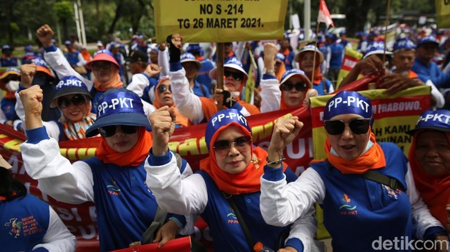 Jakarta - Ratusan pensiunan pegawai Pupuk Indonesia dan Pupuk Kaltim geruduk gedung Kementerian BUMN, Jakarta. Mereka menuntut uang pensiun seumur hidup.
